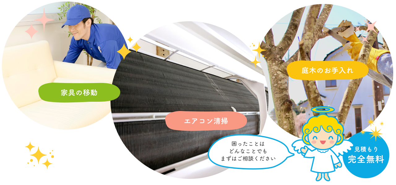 具体的な業務としては、エアコン清掃からキッチン・お風呂の清掃、草刈り、不用品回収、網戸の張り替えまで、雑事と呼ばれるお仕事はなんでも対応が可能です。